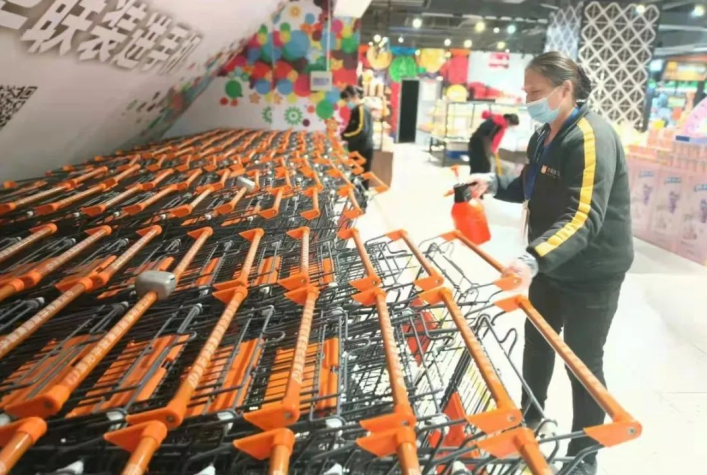門店內(nèi)嚴(yán)格執(zhí)行消毒工作,消毒購物車、貨架等重點(diǎn)關(guān)注區(qū)域,同時(shí)對電梯按鈕、扶梯、衛(wèi)生間等角落進(jìn)行定時(shí)消毒。在超市入口、收銀區(qū)等設(shè)置一米線,掃碼、量體溫、戴口罩,嚴(yán)格執(zhí)行進(jìn)門三部曲,并時(shí)刻提醒消費(fèi)者保持距離,做好疫情防控相關(guān)措施。