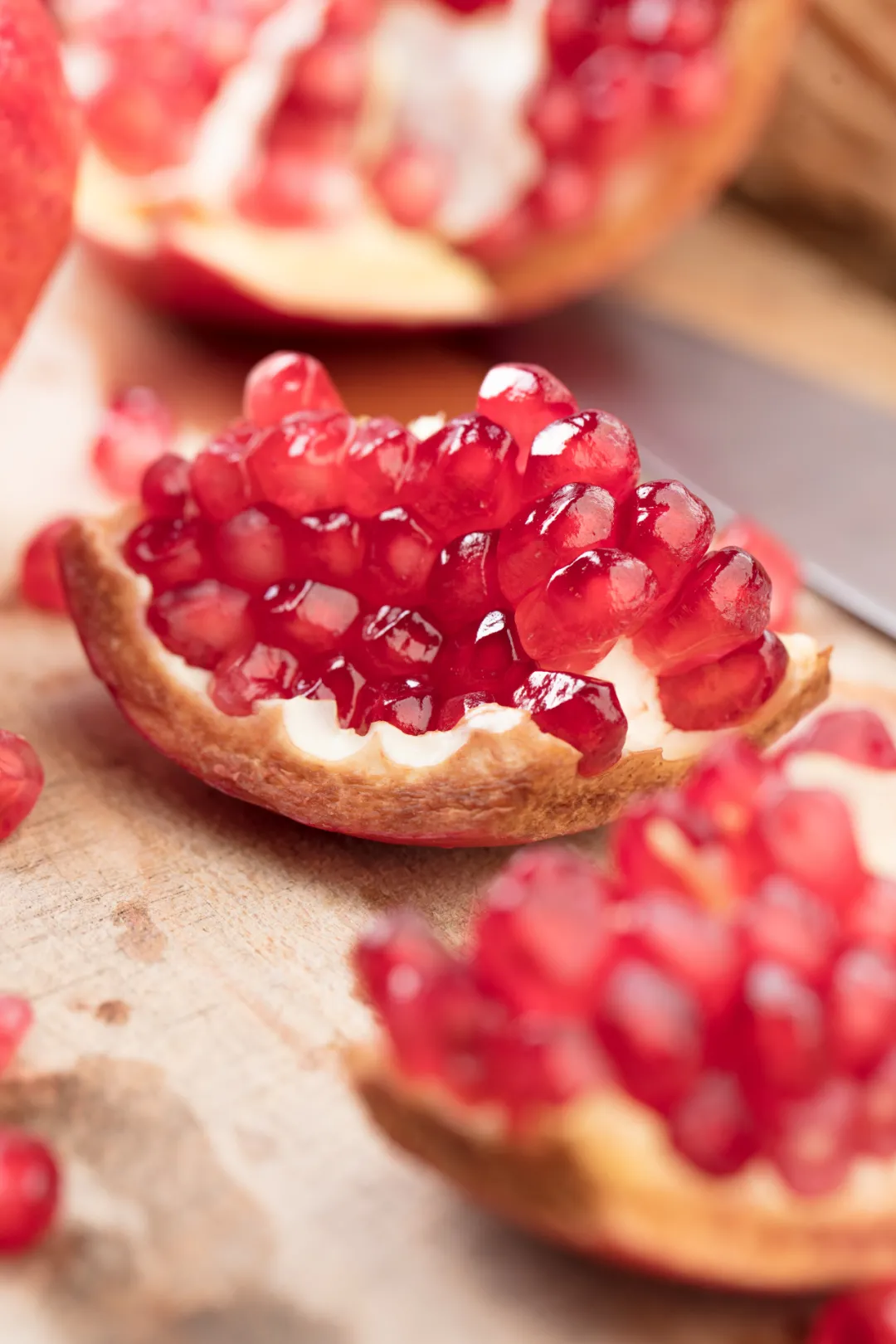 先用刀沿頂端開口,再沿著石榴內(nèi)部紋路豎向劃6刀左右,即可直接用手掰開