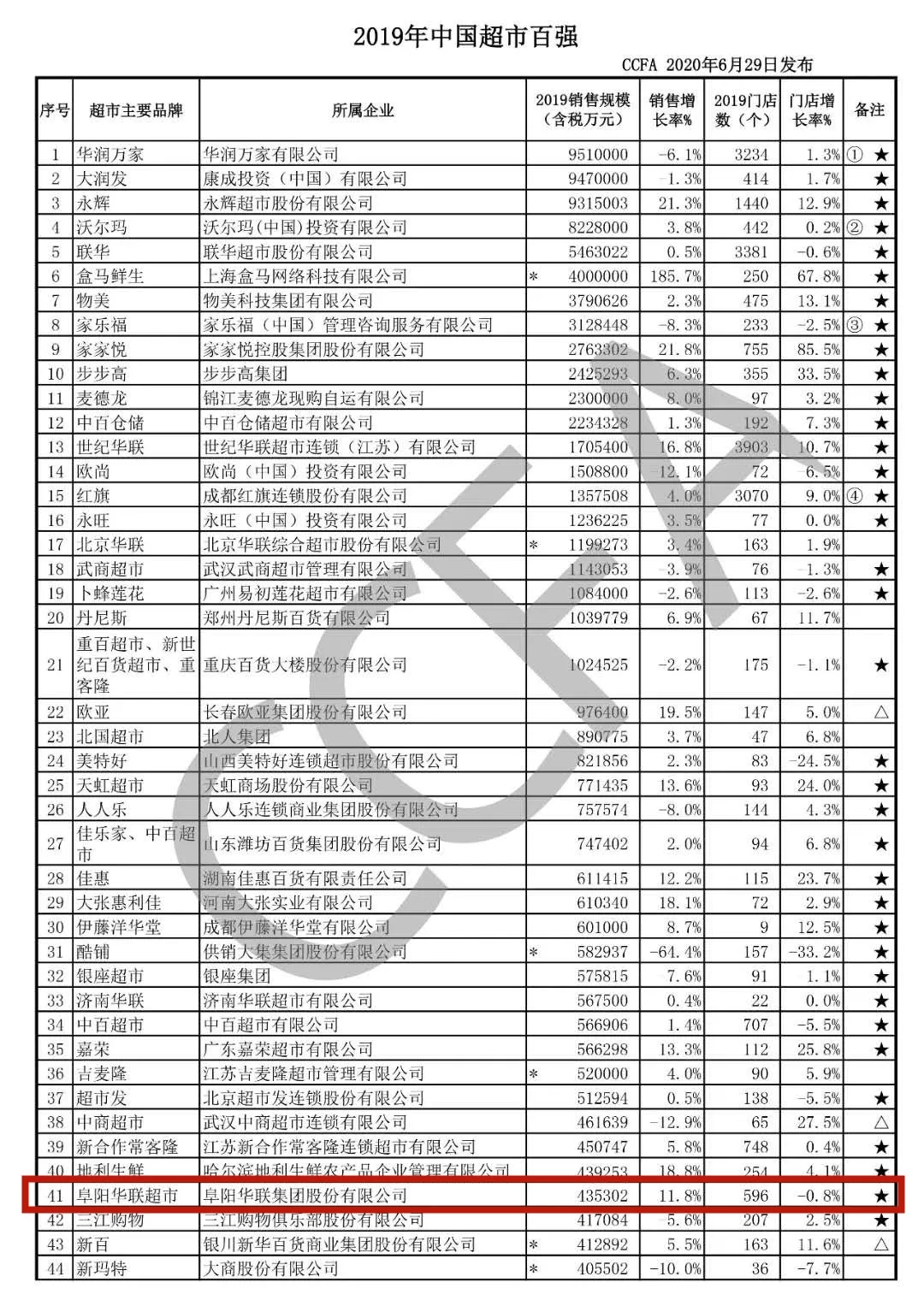 本次發(fā)布顯示:2019年的阜陽華聯(lián)再接再厲,進(jìn)軍今年榜單的第41位。