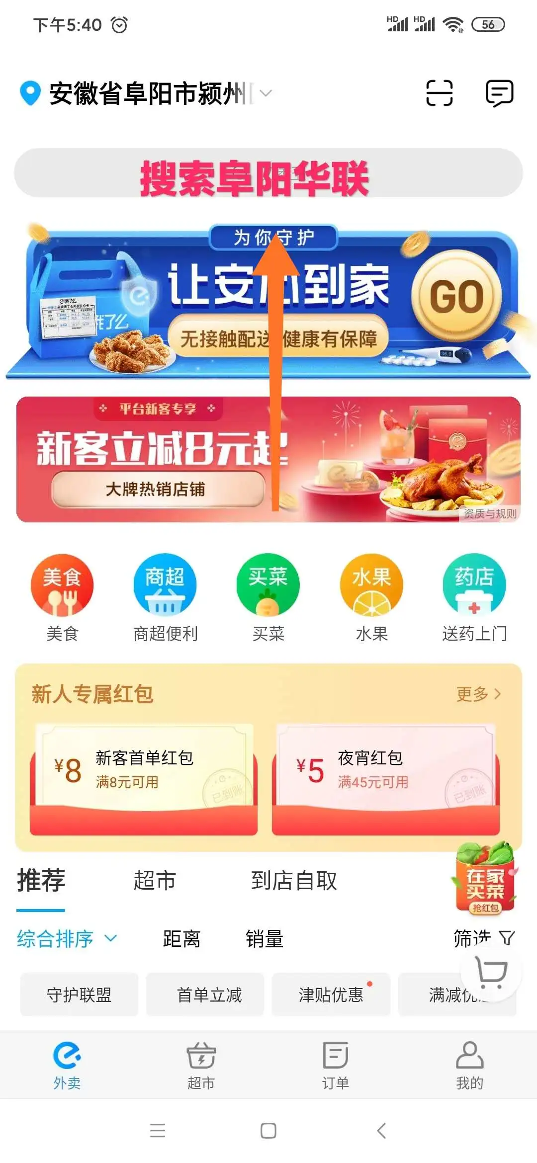 ①掃碼下載餓了么并搜索“阜陽華聯(lián)”